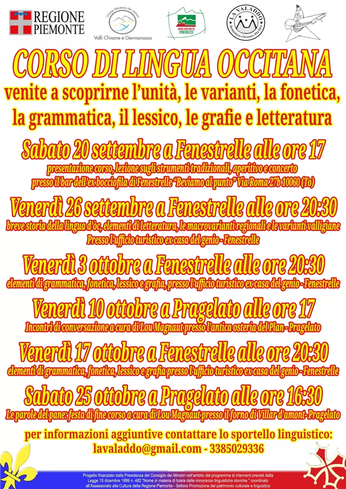 Corso di Lingua Occitanax informazionimail: lavaladdo@gmail.comTel: 3385029336 Date:26/09 ore 20:30 a Fenestrelle03/10 ore 20:30 a Fenestrelle10/10 ore 17:00 a Pragelato17/10 ore 20:30 a Fenestrelle25/10 ore 16:30 a Pragelato
